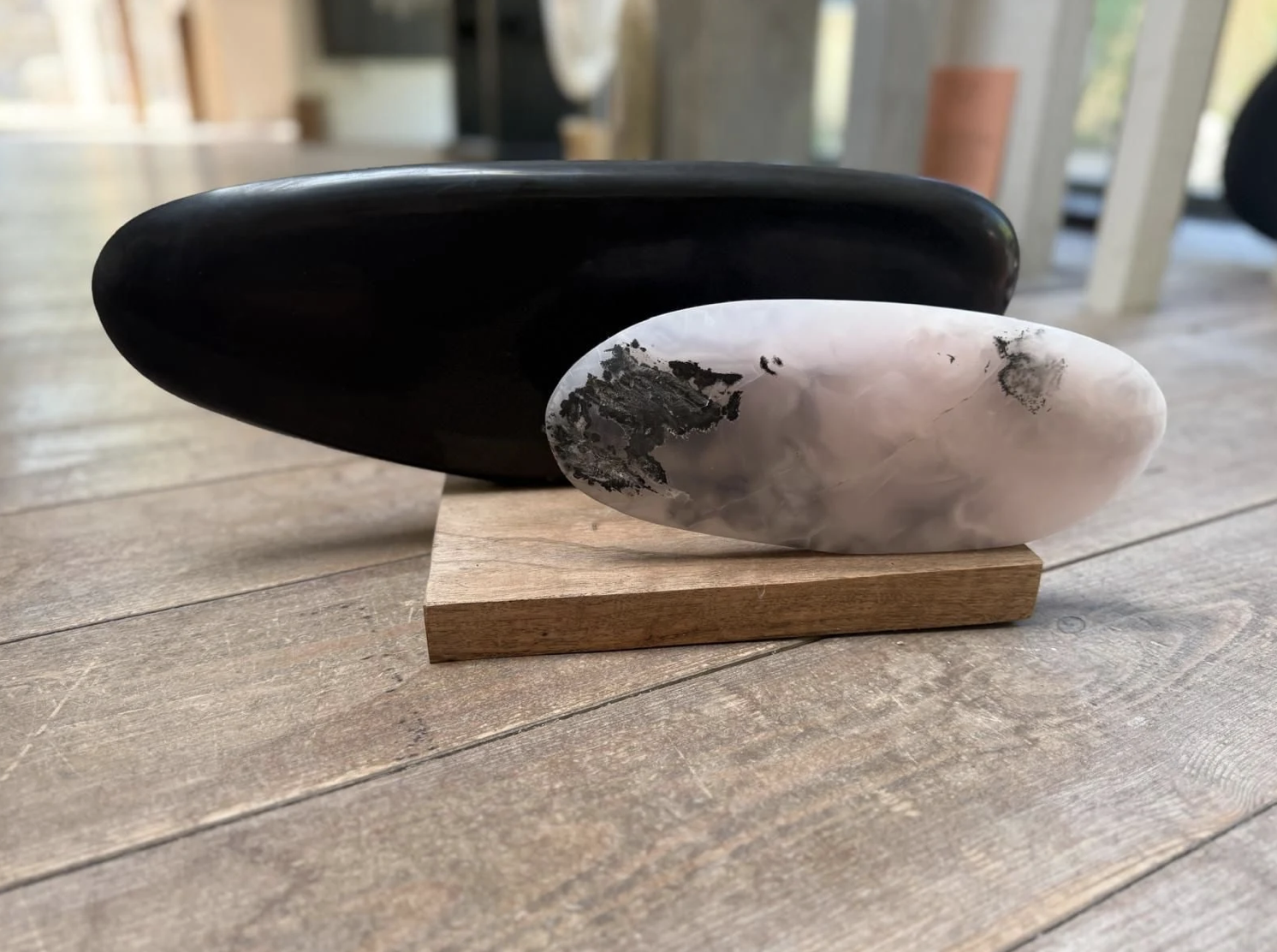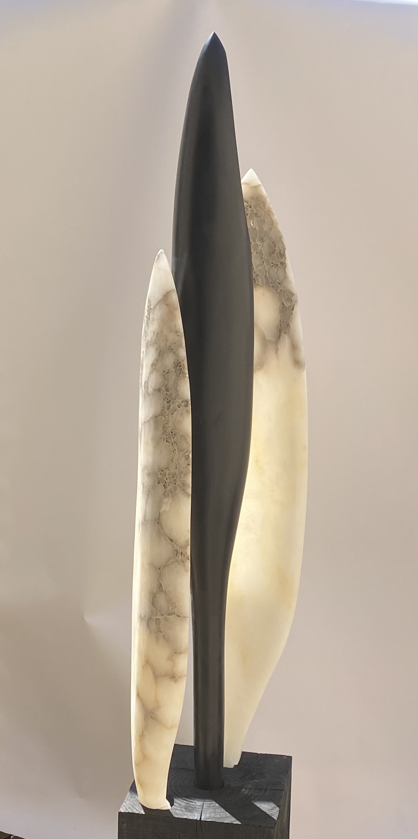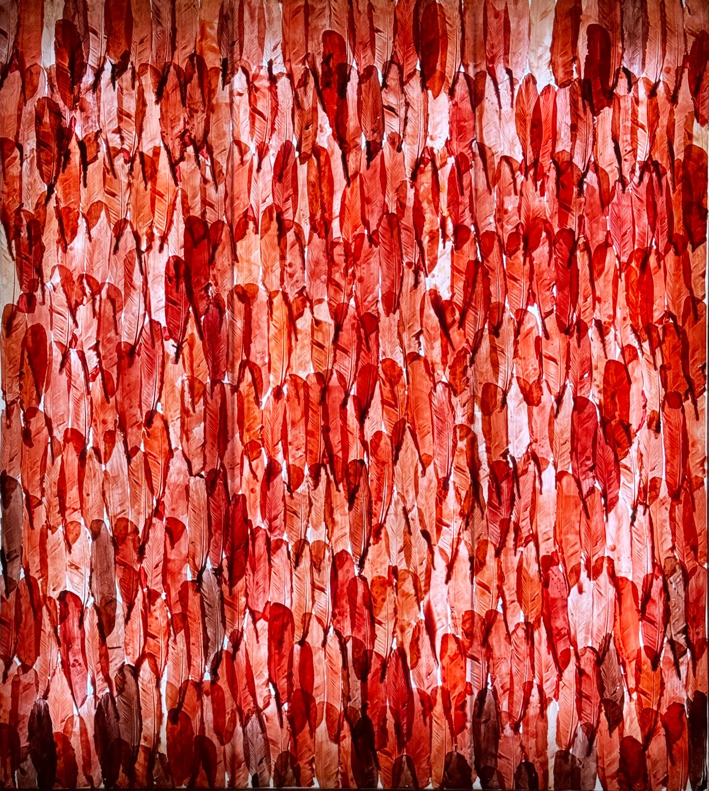 Red beeswax cast feathers on plexiglass in oak frame and led lights